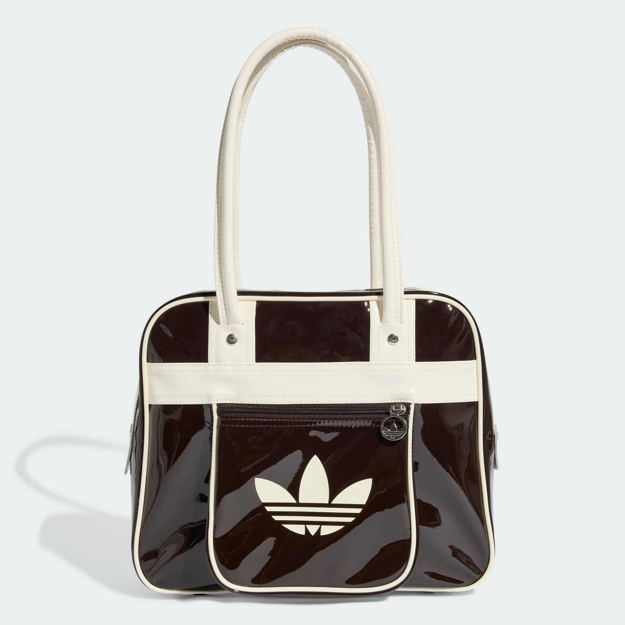 The patent construction gives a sleek, glossy look, while the iconic Trefoil branding makes a statement wherever you go. Long handles let you carry it comfortably over your shoulder, great for city adventures or casual meet-ups.