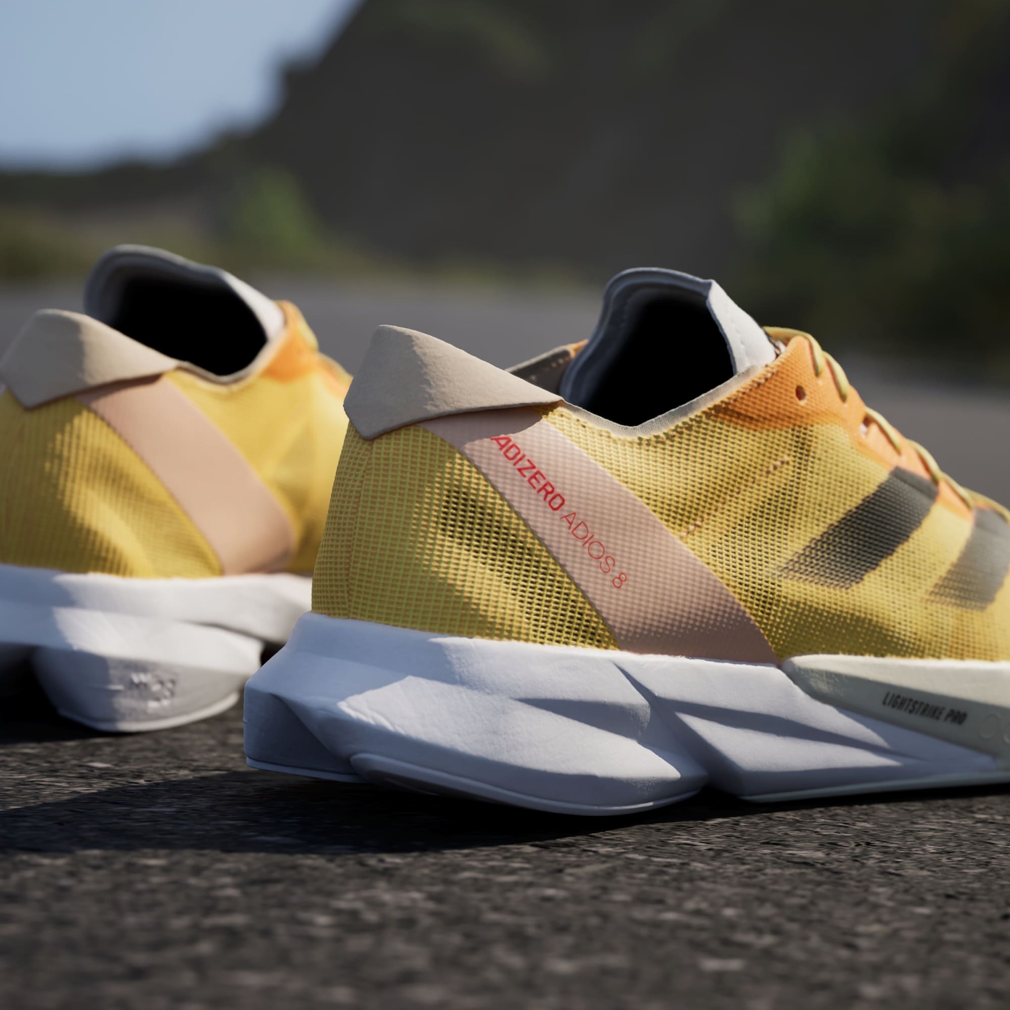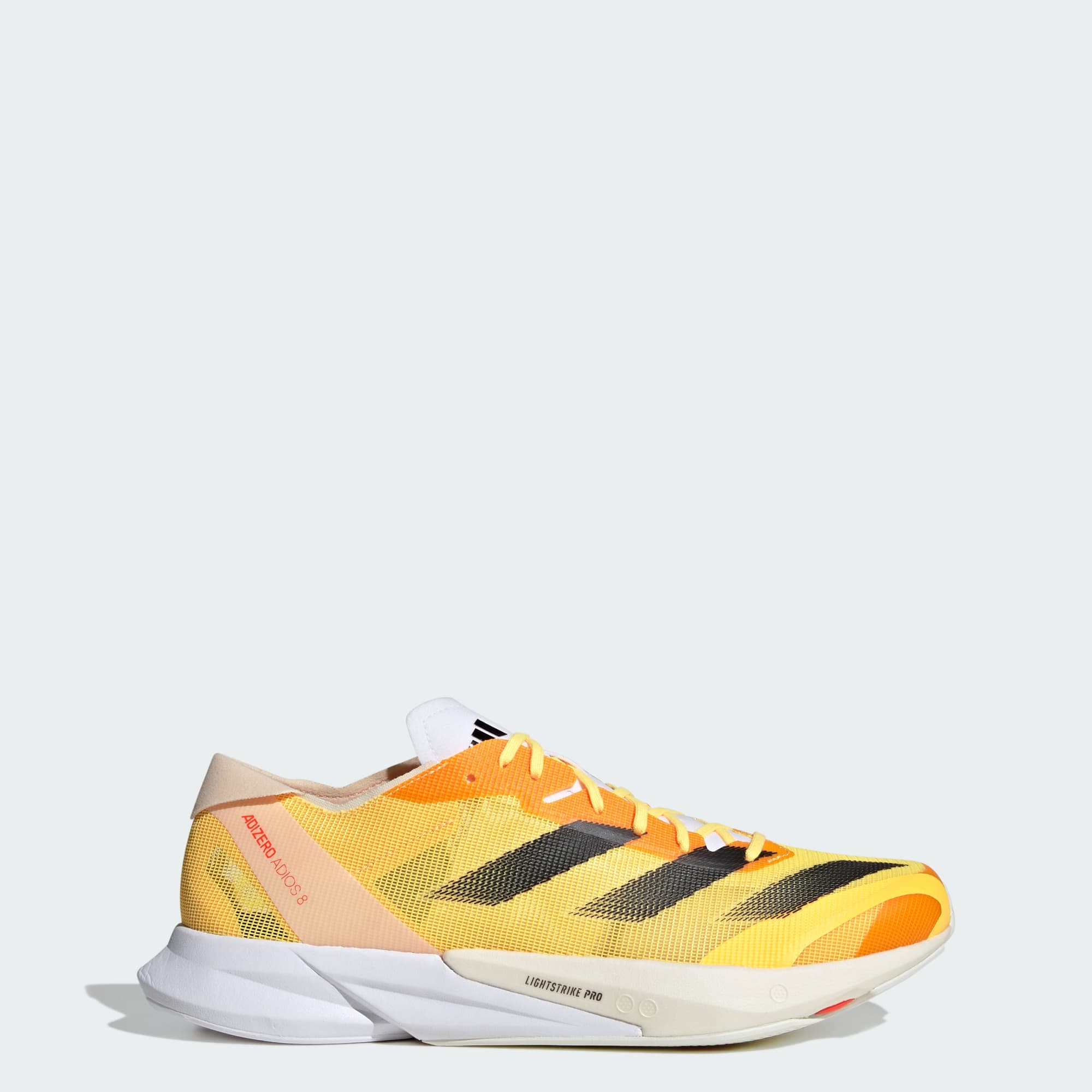 Chase your next PR in these Adizero Adios 8 shoes. The new-breathable lightweight mesh upper rides on a mix of superlight LIGHTSTRIKE 2.0 and LIGHTSTRIKE PRO foam. The hybrid makes these shoes fast enough for race day while being able to withstand daily training. The updated ENERGYTORSION ROD 2.0 is embedded in the midsole and with a new third rod that runs through the midfoot to the forefoot for a snappy toe-off in each stride. The result? A pair of running shoes that help you run faster and longer than ever before — all the while providing a soft stiffness that increases the force transfer.