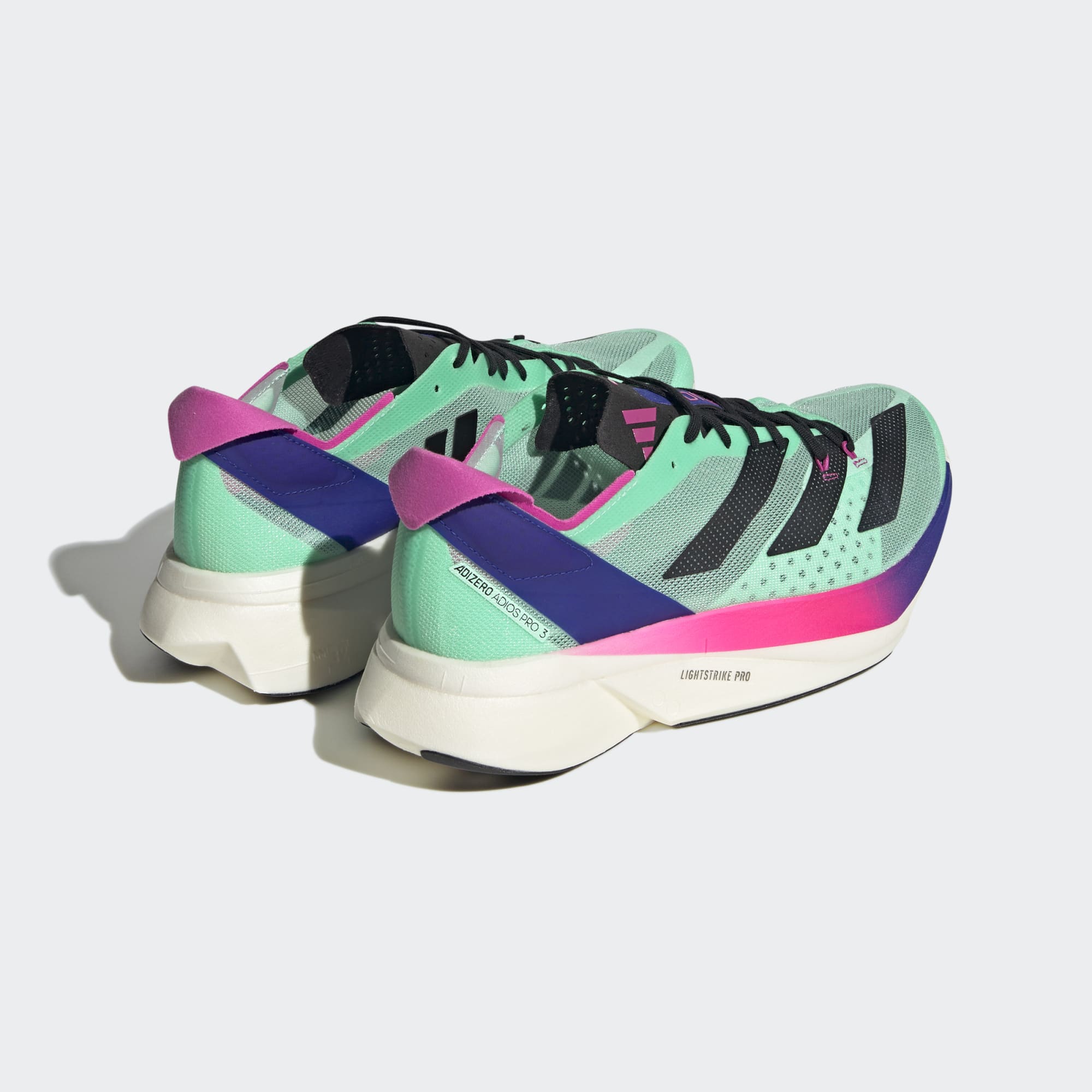 The Adizero Adios Pro 3 is the pinnacle of Adizero Racing products. It was built with and for athletes to achieve unbelievable feats. These adidas running shoes are made to optimize running efficiency. Our carbon-infused ENERGYRODS provide lightweight stiffness for a snappy, efficient stride. Ultralight LIGHTSTRIKE PRO cushions every step with two layers of our most resilient foam to help you maintain energy over the long term. It all rides on a thin layer of textile rubber outsole for extraordinary traction in wet and dry conditions.