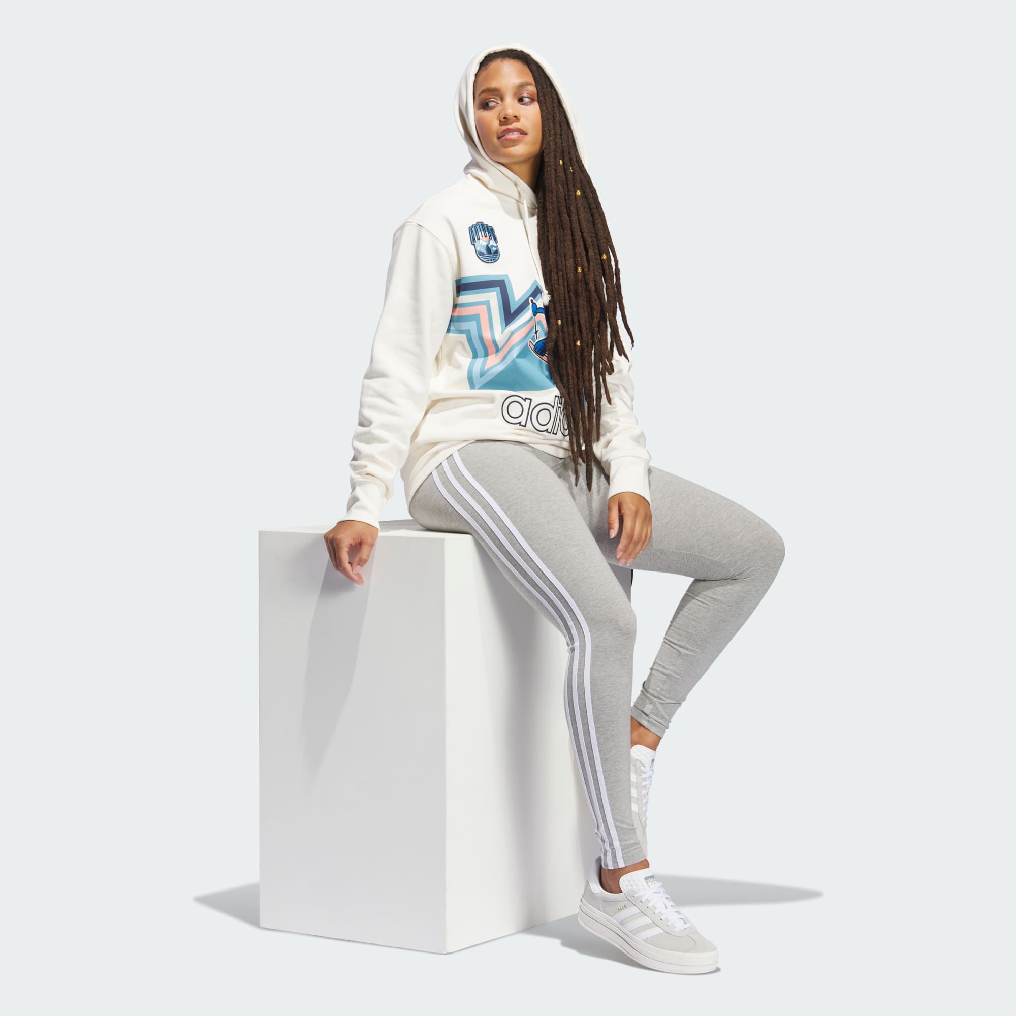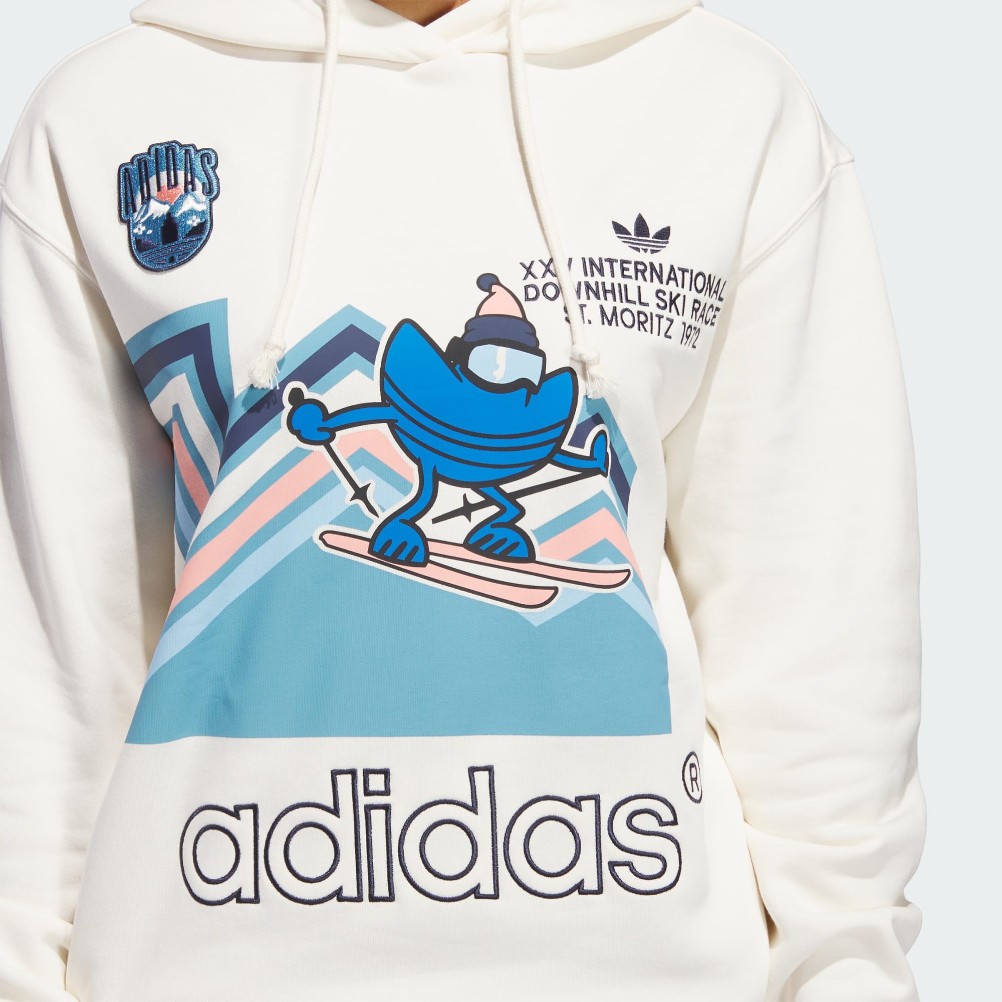 An animated take on the Trefoil carves the slopes on this adidas pullover hoodie. The graphics take cues from '70s looks, from the muted colour palette to the angular stacked lines. Layer it on with the loose fit that feels cosy while tapering to fit at the hem and cuffs.