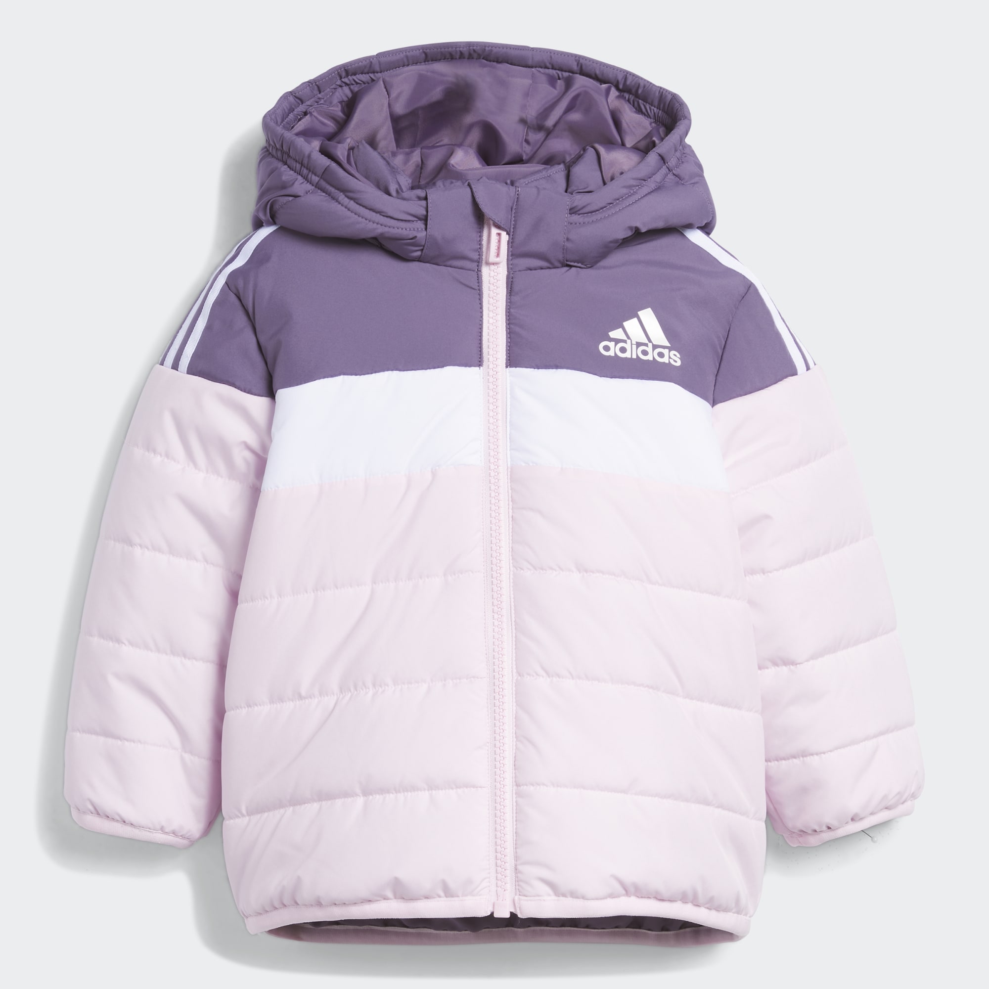 Don't let cold weather stop their adventures. Keep your little one bundled up right in this infants' adidas jacket. Synthetic insulation keeps them warm and cosy. A removable hood lets you switch up the look. Signature 3-Stripes finish it off with iconic adidas style.