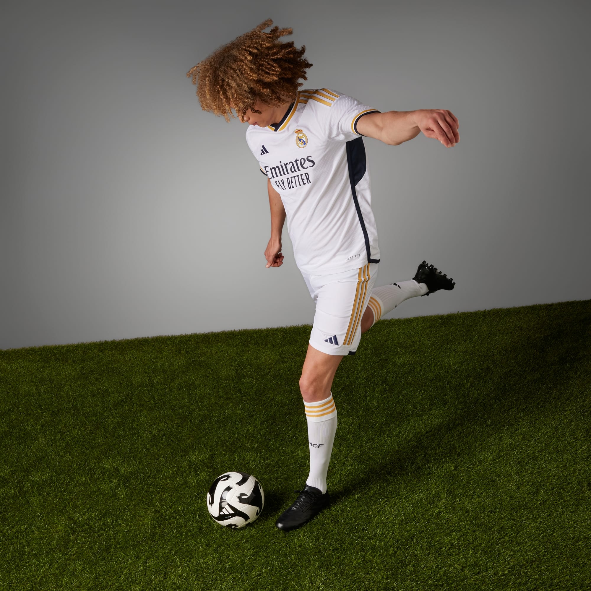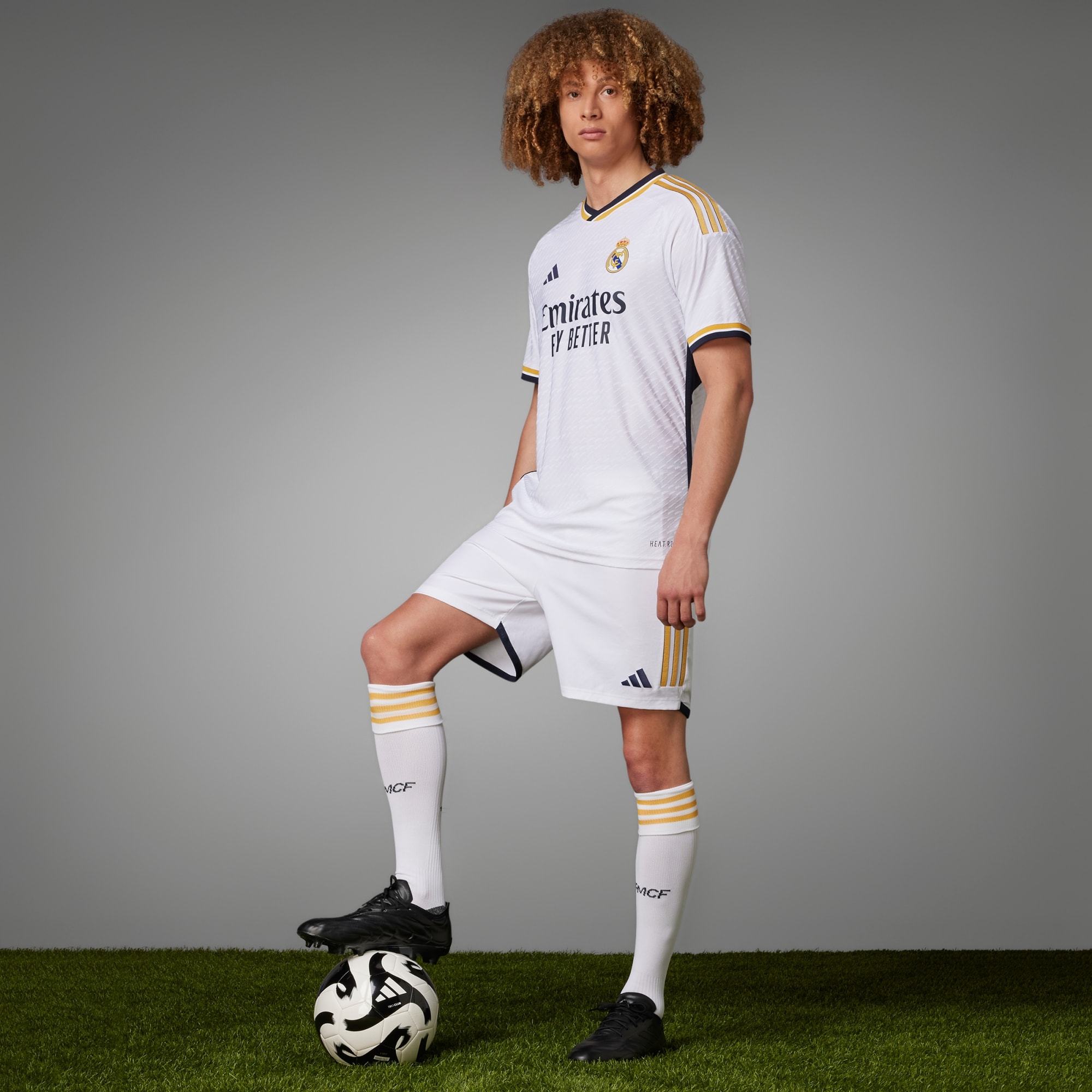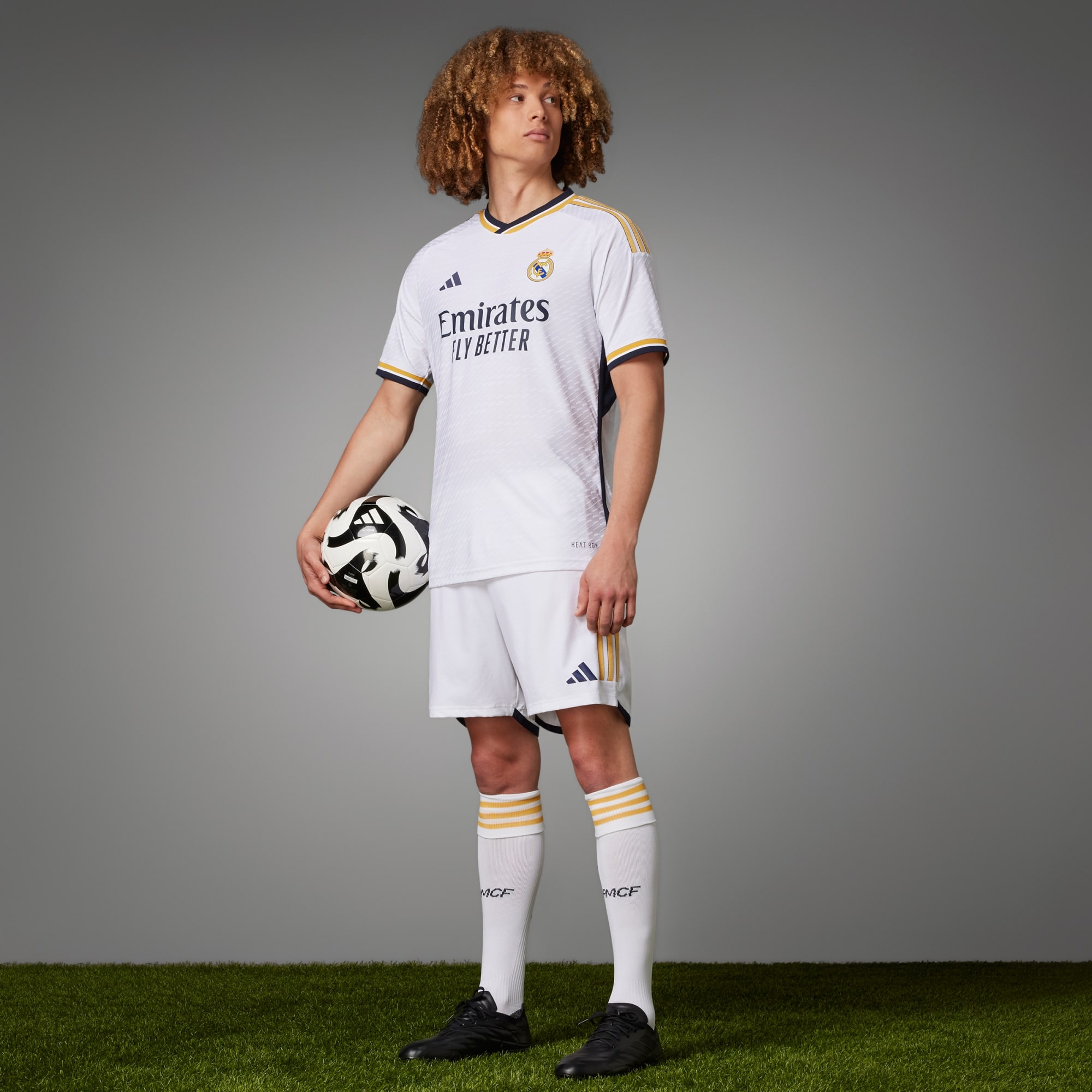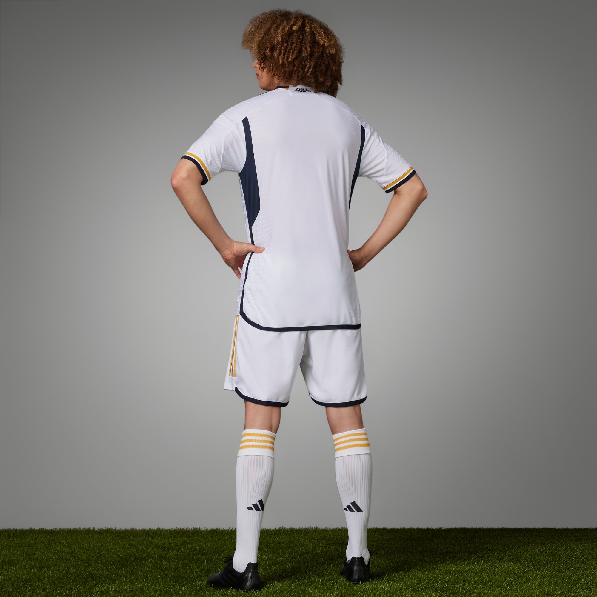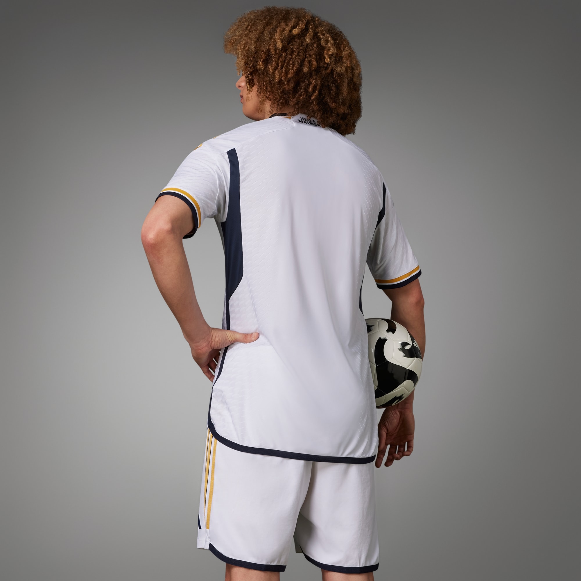 Tradition gets a golden touch in the Real Madrid 23/24 Home Authentic Jersey. Keeping a crisp all-white base, the striking kit continues the thread of powerful design, delivering a sleek, lightweight jersey steeped in legendary soccer history. With a nod to older kits, gold accents from previous kits are re-introduced alongside navy framing. An allover, sublimation print is a subtle update to the classic all-white color, complemented by a new soccer silhouette that lets you take the clubs elegance and style off-pitch. HEAT.RDY fabric maximises airflow so you can feel cool — while the heat-applied crest and "¡Hala Madrid!" on the neck shows off your winning mentality.