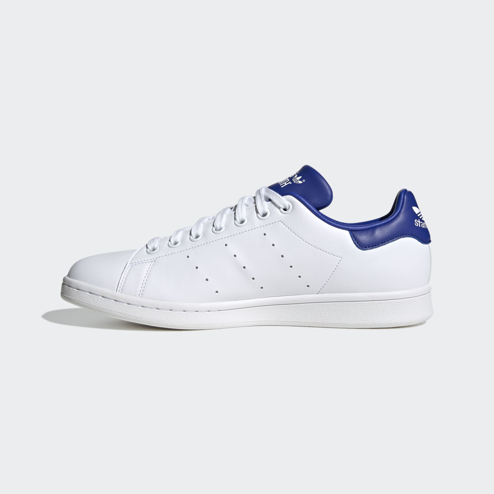 Since 1970, the adidas Stan Smith shoes have been the ultimate white leather trainer, with timeless appeal, effortless style and versatility. Today, the clean, classic silhouette has a fresh pop of colour on the heel tab and tongue. The perforated 3-Stripes are a nod to the past, and the recycled synthetic upper is a nod to the future. Make sure these shoes aren't missing from your trainer rotation. Made with a series of recycled materials, this upper features at least 50% recycled content. This product represents just one of our solutions to help end plastic waste.